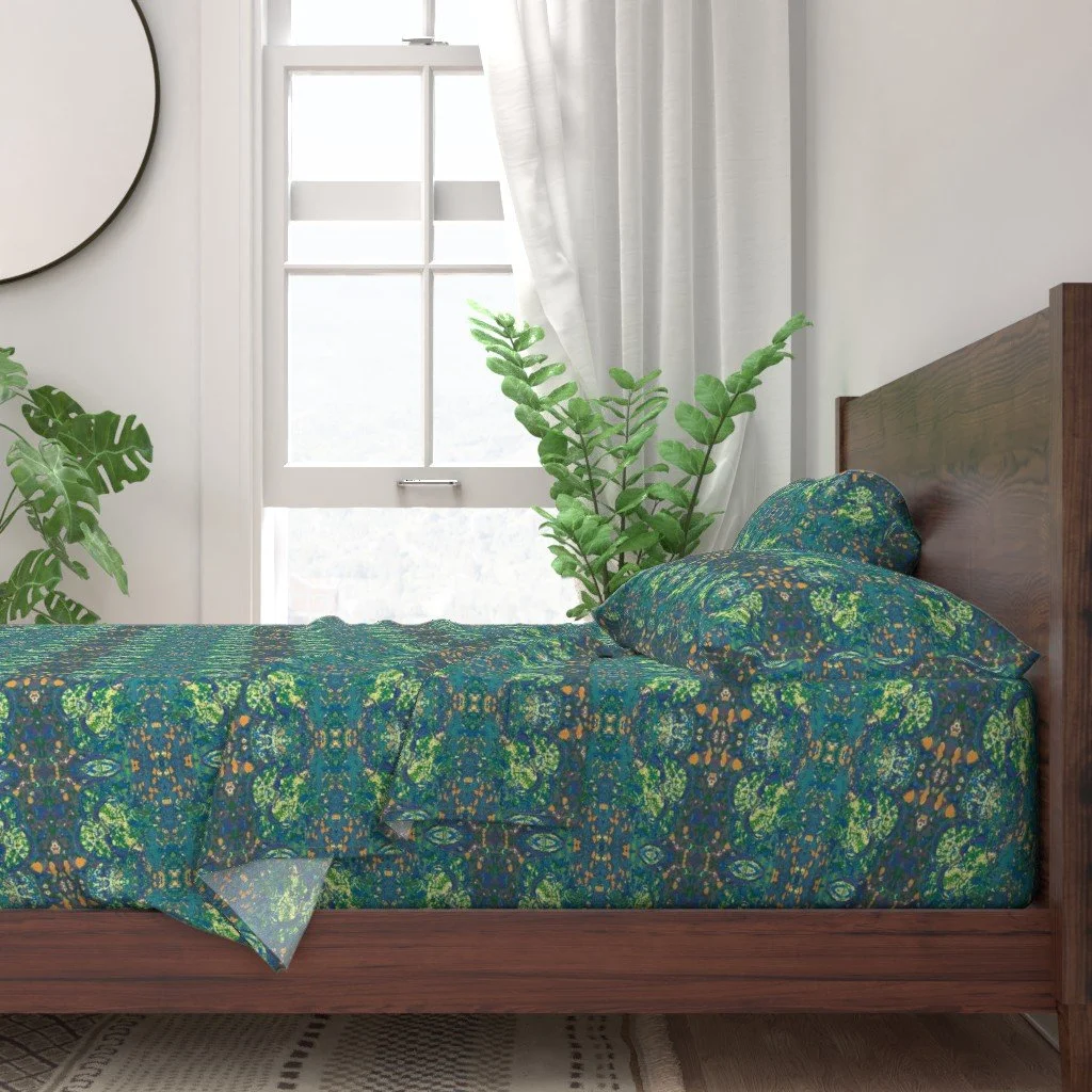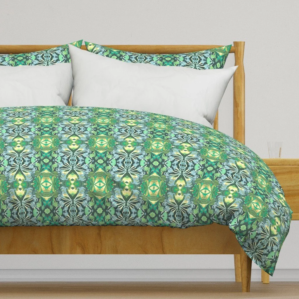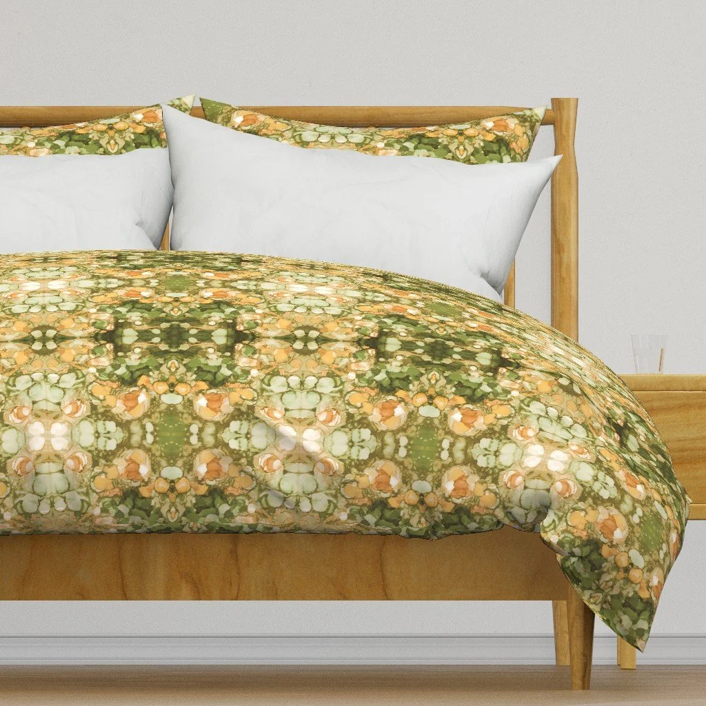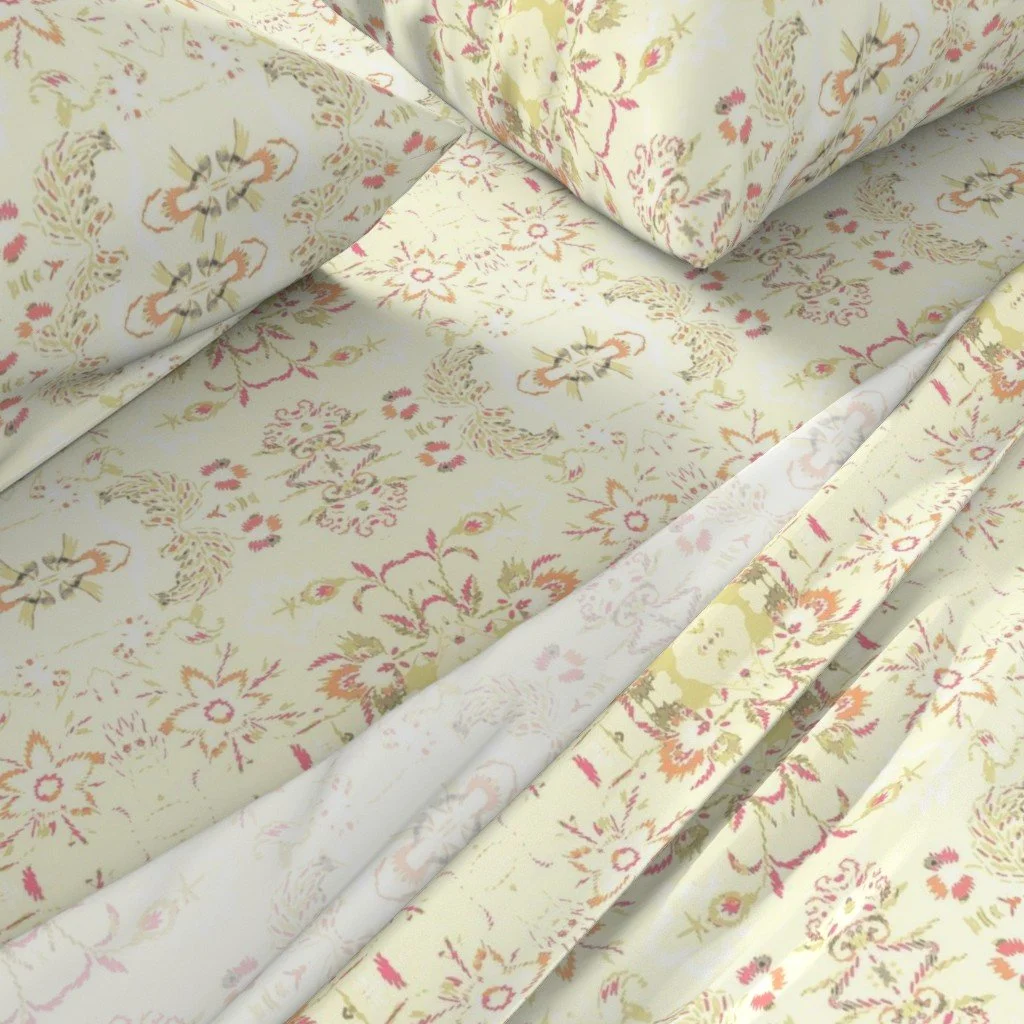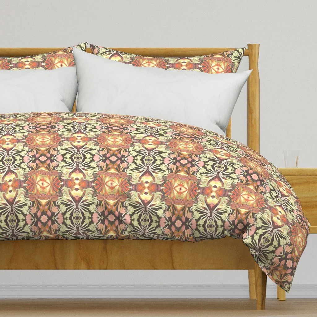 All of the fabrics & wallpapers are designed by Moondance Farm Studios founder, Amy Masterman. She creates original artwork in a variety of media as the starting point, and then manipulates it in various ways to transform it into a whole new design. A few of the patterns are collaborations with other Moondance artists.